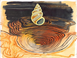 “Shell and Mine,” watercolor and gouache on paper, 9” x 12”