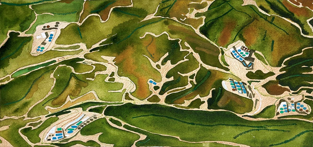 “Rare Earth Mining, Myanmar,” watercolor on paper, 7.5” x 15”