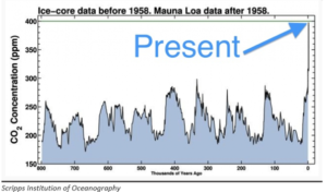 This graph shows CO2 concentrations in the atmosphere over the last 800,000 years. The C02 level at the beginning of the industrial period was 280ppm. Concentrations spiked in the 20thcentury. About half of the total anthropogenic CO2 emissions since 1750 have occurred in the last 40 years.