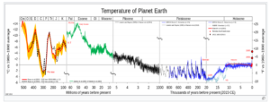 This table by Glenn Fergus shows the extraordinarily even temperatures during the Holocene epoch—the last ten thousand years in which human civilization developed. Global temperatures have never increased or decreased by more than 0.5oC in that period as compared with average temperatures during the period 1960-90. The end of the scale shows potential temperature increases in 2050 and 2100.